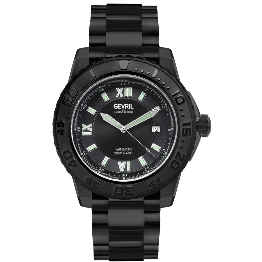 Black stainless steel case with a black stainless steel bracelet. Uni-directional rotating black stainless steel bezel. Black dial with silver-tone sword-shaped hands and Roman numeral & index hour markers. Minute scale around the inner rim. Dial Type: Analog. Luminescent hands and markers. Date display at the 3 o'clock position. Automatic movement with a 20-hour power reserve. Scratch resistant sapphire crystal. Screw down crown. Solid case back. Round case shape, case size: 45 mm, case thickness: 14 mm. Band width: 22 mm. Deployment with push button release clasp. Water resistant at 200 meters / 660 feet. Functions: date, hour, minute, second. Fashion watch style. Watch label: Swiss Made. Gevril Seacloud Automatic Black Dial Mens Watch 3122B.