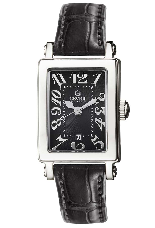 Silver-tone stainless steel case with a black calfskin leather strap. Fixed silver-tone stainless steel bezel. Black dial with silver-tone hands and Arabic numeral hour markers. Minute scale around the inner rim. Dial Type: Analog. Date display at the 6 o'clock position. Quartz movement. Scratch resistant antireflective sapphire crystal. Push/pull crown. Solid case back. Rectangle case shape, case size: 21 28 mm, case thickness: 9 mm. Band width: 13 mm, band length: 7.5 inches. Deployment tang buckle clasp. Water resistant at 50 meters / 165 feet. Functions: date, hour, minute, second. Casual watch style. Watch label: Swiss Made. Gevril Super Mini Black Dial Ladies Watch 8042N.