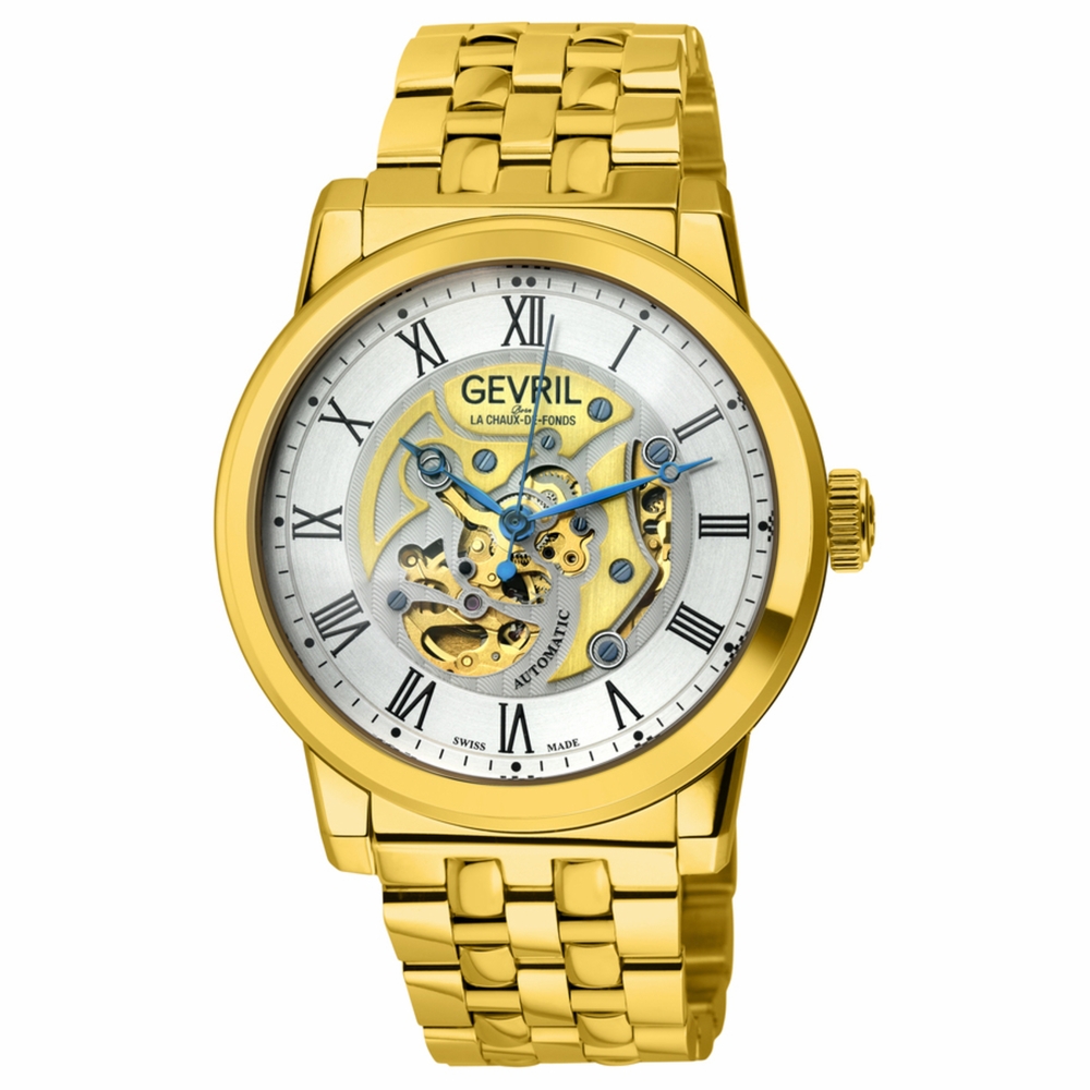 Yellow gold-tone stainless steel case and bracelet. Fixed yellow gold-tone stainless steel bezel. Silver-tone dial with blue hands and Roman numeral hour markers. Minute markers around the outer rim. Dial Type: Analog. Automatic movement. Scratch resistant sapphire crystal. Pull / push crown. Transparent case back. Round case shape, case size: 47 mm, case thickness: 13 mm. Band width: 22 mm. Deployment with push button release clasp. Water resistant at 50 meters / 165 feet. Functions: hour, minute, second. Additional Info: skeleton dial. Vanderbilt Series. Luxury watch style. Watch label: Swiss Made. Gevril Vanderbilt Silver-tone Dial Mens Watch 22692B.