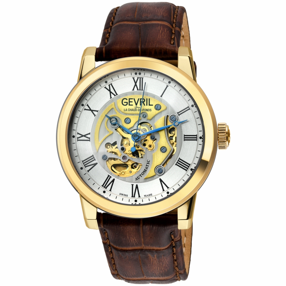 Yellow gold-tone stainless steel case with a brown leather strap. Fixed yellow gold-tone stainless steel bezel. Silver-tone dial with blue hands and Roman numeral hour markers. Minute markers around the outer rim. Dial Type: Analog. Automatic movement. Scratch resistant sapphire crystal. Pull / push crown. Transparent case back. Round case shape, case size: 47 mm, case thickness: 13 mm. Band width: 22 mm. Deployment with push button release clasp. Water resistant at 50 meters / 165 feet. Functions: hour, minute, second. Additional Info: skeleton dial. Vanderbilt Series. Luxury watch style. Watch label: Swiss Made. Gevril Vanderbilt Silver-tone Dial Mens Watch 22695.