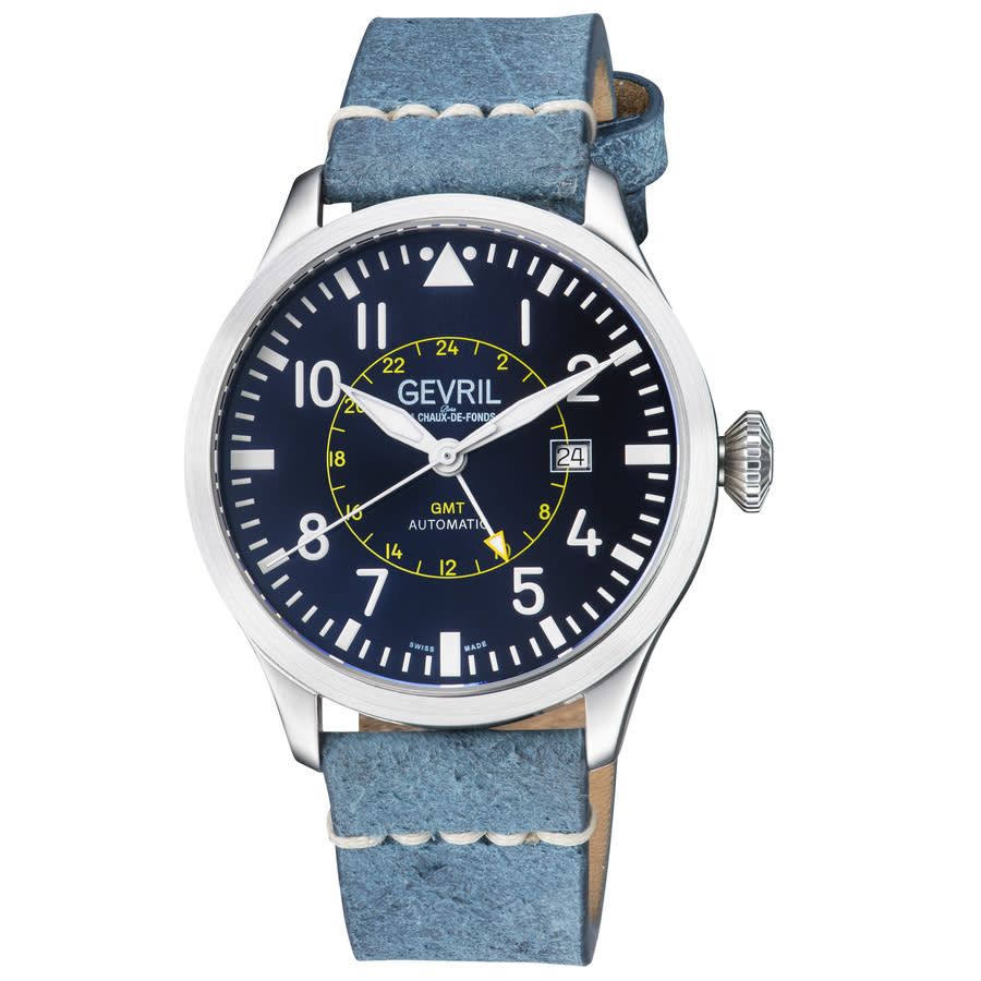 Silver-tone stainless steel case with a blue leather strap. Fixed silver-tone bezel. Blue dial with silver-tone diamond-shaped hands and Arabic numeral & index hour markers. Minute scale around the inner rim. Dial Type: Analog. Luminescent hands and markers. Date display at the 3 o'clock position. One subdial displaying: 24 hour. Gevril Calibre Sellita SW330 automatic movement. Scratch resistant sapphire crystal. Pull / push crown. Transparent case back. Round case shape, case size: 44 mm, case thickness: 11 mm. Band width: 20 mm. Buckle clasp. Water resistant at 50 meters / 165 feet. Functions: GMT, second time zone, hour, minute, second. Additional Info: GMT. Vaughn Series. Luxury watch style. Watch label: Swiss Made. Gevril Vaughn Automatic Blue Dial Mens Watch 44504.