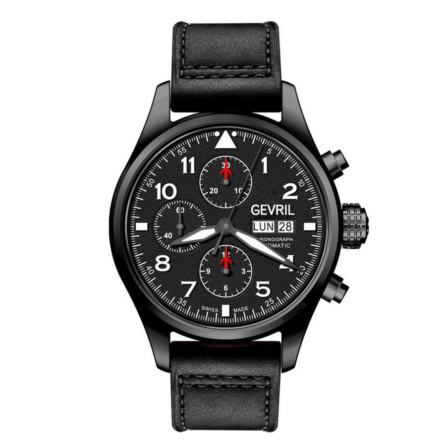 Silver-tone stainless steel case with a black leather strap. Fixed black stainless steel bezel. Black dial with black sword-shaped hands and Arabic numeral & index hour markers. Minute markers around the outer rim. Dial Type: Analog. Luminescent hands and markers. Day/date display at the 3 o'clock position. Chronograph - sub-dials displaying: three. Automatic movement. Scratch resistant sapphire crystal. Pull / push crown. Transparent case back. Round case shape, case size: 42 mm, case thickness: 15 mm. Band width: 20 mm. Tang clasp. Water resistant at 50 meters / 165 feet. Functions: chronograph, day, date, hour, minute, second. Additional Info: eta 7750 Swiss automatic movement. Vaughn Series. Luxury watch style. Watch label: Swiss Made. Gevril Vaughn Chronograph Automatic Black Dial Mens Watch 47001.