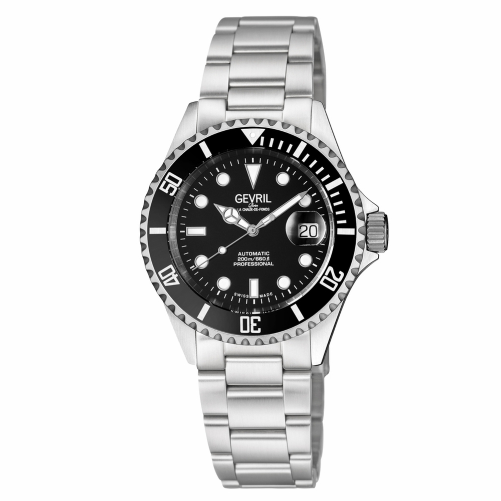 Stainless steel case with a stainless steel bracelet. Uni-directional rotating stainless steel bezel with an inlaid black ceramic ring. Black dial with luminous silver-tone hands and dot hour markers. Minute markers around the outer rim. Dial Type: Analog. Luminescent hands and markers. Date display at the 3 o'clock position. Sellita caliber SW200 automatic movement, containing 26 Jewels, bitting at 28800 vph, and has a power reserve of approximately 38 hours. Scratch resistant sapphire crystal. Screw down crown. Solid case back. Round case shape. Case size: 43 mm. Case thickness: 13 mm. Band width: 20 mm. Deployment clasp with a push button release. Water resistant at 200 meters / 660 feet. Functions: date, hour, minute, second. Additional Info: magnified date window. Wallstreet Series. Luxury watch style. Watch label: Swiss Made. Gevril Wallstreet Automatic Black Dial Mens Watch 4850A.