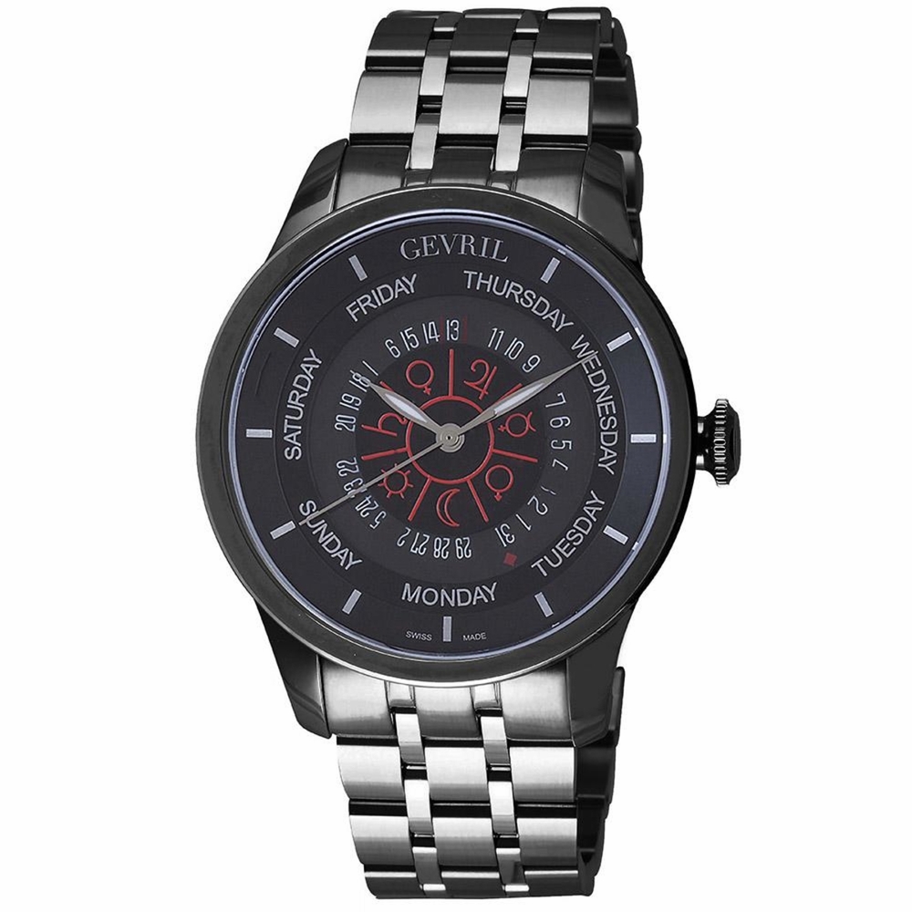 Stainless steel case with a black stainless steel bracelet. Stationary black bezel. Black dial with silver-tone hands and index hour markers. Dial Type: Analog. Luminescent hands. Day and date. ETA Caliber 2834-2 automatic movement with a 38-hour power reserve. Scratch resistant antireflective sapphire crystal. Case size: 45 mm. Case thickness: 12 mm. Round case shape. Band width: 22 mm. Band length: 8.5 inches. Deployant buckle clasp. Water resistant at 50 meters / 165 feet. Functions: date, day, hour, minute, second. Casual watch style. Watch label: Swiss Made. Gevril Columbus Circle Automatic Mens Watch 2001B.