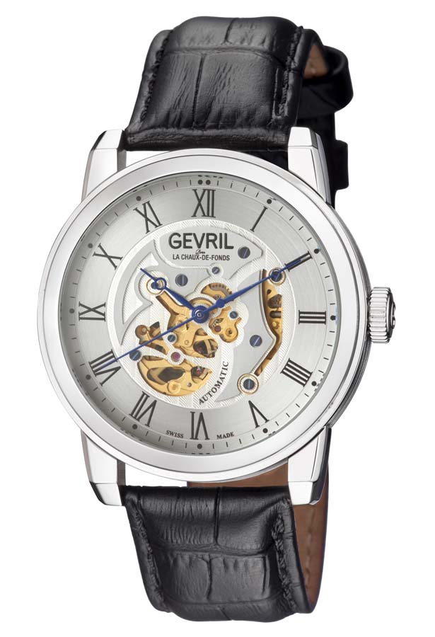Silver-tone stainless steel case with a black leather strap. Fixed silver-tone stainless steel bezel. Silver dial with blue hands and Roman numeral hour markers. Minute markers around the outer rim. Dial Type: Analog. Automatic movement. Scratch resistant antireflective sapphire crystal. Push/pull crown. Transparent case back. Round case shape, case size: 47 mm, case thickness: 13 mm. Band width: 22 mm, band length: 8.5 in. Deployant buckle clasp. Water resistant at 50 meters / 165 feet. Functions: hour, minute, second. Casual watch style. Watch label: Swiss Made. Gevril Vanderbilt Automatic Silver Dial Mens Watch 2690.