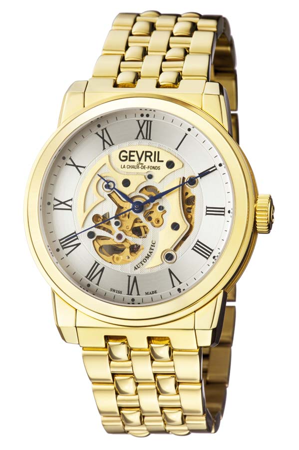 Yellow gold-tone stainless steel case and bracelet. Fixed yellow gold-tone bezel. Silver (skeleton center) dial with blue hands and Roman numeral hour markers. Minute markers around the outer rim. Dial Type: Analog. Automatic movement. Scratch resistant anti-reflective sapphire crystal. Pull / push crown. Transparent case back. Round case shape. Case size: 47 mm. Case thickness: 13 mm. Band width: 22 mm. Band length: 8.5 inches. Deployant buckle clasp. Water resistant at 50 meters / 165 feet. Functions: hour, minute, second. Vanderbilt Series. Casual watch style. Watch label: Swiss Made. Gevril Vanderbilt Automatic Silver Dial Mens Watch 2692.