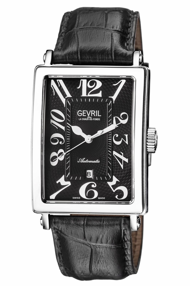 Silver-tone stainless steel case with a black leather strap. Stationary silver-tone bezel. Black dial with silver-tone hands and Arabic numeral hour markers. Dial Type: Analog. Date display at the 3 o'clock position. Caliber MD3G automatic movement. Scratch resistant antireflective sapphire crystal. Case size: 34.5x44 mm. Case thickness: 13.5 mm. Rectangle case shape. Band width: 23 mm. Band length: 8.5 inches. Buckle clasp. Water resistant at 50 meters / 165 feet. Functions: date, hour, minute, second. Dress watch style. Watch label: Swiss Made. Gevril Avenue of Americas Automatic Mens Watch 5061.