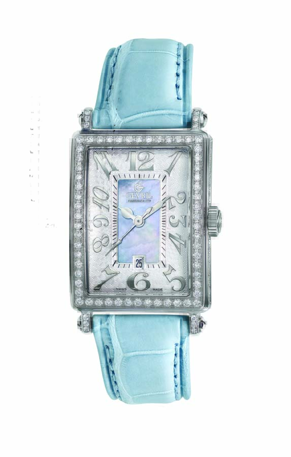 Silver-tone stainless steel case with a blue calfskin alligator band. Fixed silver-tone stainless steel bezel. Mop dial with silver-tone hands and Arabic numeral hour markers. Minute scale around the inner rim. Dial Type: Analog. Date display at the 6 o'clock position. Quartz movement. Scratch resistant antireflective sapphire crystal. Push/pull crown. Solid case back. Rectangle case shape, case size: 32 x 25 mm, case thickness: 9.5 mm. Band width: 18 mm, band length: 7.5 inches. Buckle clasp. Water resistant at 50 meters / 165 feet. Functions: date, hour, minute, second. Casual watch style. Watch label: Swiss Made. Gevril Avenue of Americas Mini Ladies Watch 7247NV.