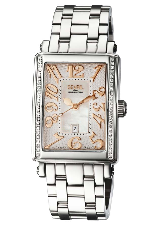 Silver-tone stainless steel case with a silver stainless steel bracelet. Fixed silver-tone stainless steel bezel. White mother of pearl dial with rose gold-tone hands and Arabic numeral hour markers. Minute markers around the outer rim. Dial Type: Analog. Date display at the 6 o'clock position. Quartz movement. Scratch resistant antireflective sapphire crystal. Push/pull crown. Solid case back. Rectangle case shape, case size: 37 x30 mm, case thickness: 10 mm. Band width: 30 mm, band length: 7.5 in. Deployant buckle clasp. Water resistant at 50 meters / 165 feet. Functions: date, hour, minute, second. Dress watch style. Watch label: Swiss Made. Gevril Mezzo White Mother of Pearl Dial Ladies Watch 9249REB.