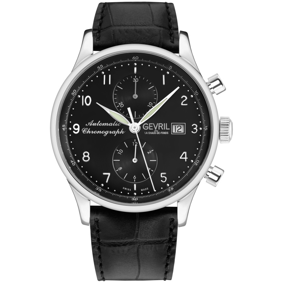 Silver-tone stainless steel case with a black leather strap. Fixed silver-tone stainless steel bezel. Black dial with silver-tone leaf-style shape hands and Arabic numeral hour markers. Minute markers around the outer rim. Dial Type: Analog. Luminescent hands. Date display at the 3 o'clock position. Chronograph - two sub-dials displaying: 30 minutes, 12 hours. ETA-Valjoux Caliber 7750 Automatic movement, containing 25 Jewels, bitting at 28800 vph, and has a power reserve of approximately 44 hours. Scratch resistant sapphire crystal. Pull / push crown. Solid case back. Round case shape, case size: 44 mm, case thickness: 14 mm. Band width: 22 mm. Buckle clasp. Water resistant at 50 meters / 165 feet. Functions: chronograph, hour, minute, second, date. West Side Series. Fashion watch style. Watch label: Swiss Made. Gevril West Side Chronograph Automatic Black Dial Mens Watch 45500.