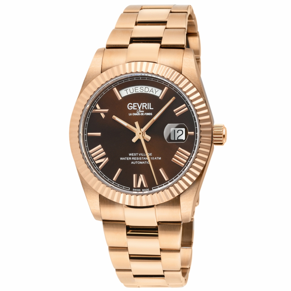 Rose gold-tone stainless steel case and bracelet. Fixed rose gold-tone stainless steel bezel. Brown dial with rose gold-tone hands and Roman numeral & index hour markers. Minute markers around the outer rim. Dial Type: Analog. Luminescent hands. Date display at the 3 o'clock position. Sellita Caliber SW200 Automatic movement, containing 26 Jewels, bitting at 28800 vph, and has a power reserve of approximately 38 hours. Scratch resistant sapphire crystal. Screw down crown. Transparent case back. Round case shape, case size: 40 mm, case thickness: 12.5 mm. Band width: 22 mm. Deployment with push button release clasp. Water resistant at 100 meters / 330 feet. Functions: date, hour, minute, second. Additional Info: fluted bezel, day at 12 o'clock. West Village Series. Luxury watch style. Watch label: Swiss Made. Gevril West Village Brown Dial Mens Watch 48953B.
