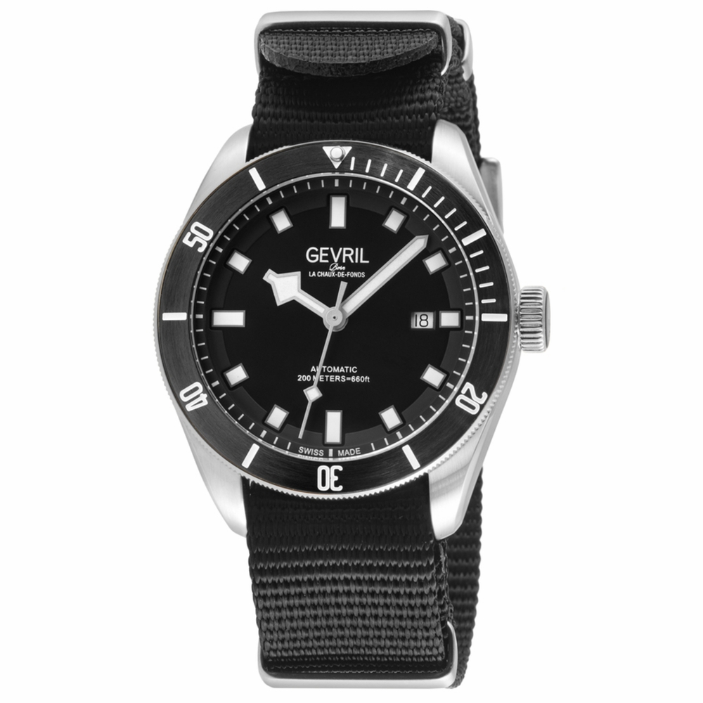 Silver-tone stainless steel case with a black canvas strap. Uni-directional rotating black stainless steel bezel. Black dial with silver-tone hands and index hour markers. Minute markers around the outer rim. Dial Type: Analog. Luminescent hands and markers. Date display at the 3 o'clock position. Sellita Caliber SW200 Automatic movement, containing 26 Jewels, bitting at 28800 vph, and has a power reserve of approximately 38 hours. Scratch resistant sapphire crystal. Screw down crown. Round case shape, case size: 43 mm, case thickness: 13 mm. Band width: 22 mm. Buckle clasp. Water resistant at 200 meters / 660 feet. Functions: date, hour, minute, second. Yorkville Series. Luxury watch style. Watch label: Swiss Made. Gevril Yorkville Automatic Black Dial Mens Watch 48600N.
