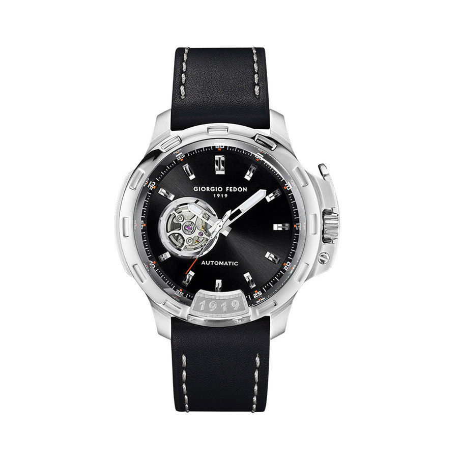 Silver-tone stainless steel case with a black leather strap. Fixed silver-tone stainless steel bezel. Black dial with silver-tone hands and index hour markers. Minute markers around the outer rim. Dial Type: Analog. Luminescent hands. TMI Caliber NH38 Automatic movement, containing 24 Jewels, bitting at 21600 vph, and has a power reserve of approximately 41 hours. Scratch resistant hardlex crystal. Pull / push crown. Transparent case back. Round case shape, case size: 45 mm, case thickness: 16.8 mm. Band width: 22 mm. Tang clasp. Water resistant at 100 meters / 330 feet. Functions: hour, minute, second. Luxury watch style. Watch label: Japan Movt. Giorgio Fedon 1919 Timeless IV Black Dial Mens Watch GFBG015.