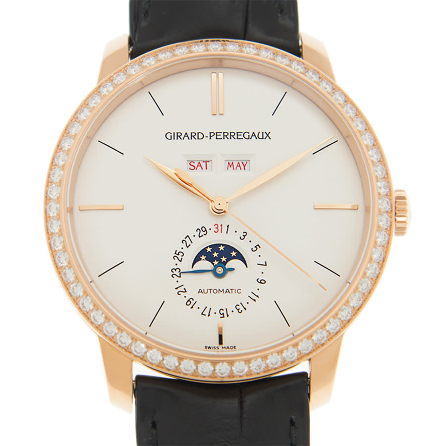 Rose gold-tone 18kt rose gold case with a black alligator band. Fixed rose gold-tone bezel with diamond set 18kt rose gold. White dial with rose gold-tone hands and index hour markers. Dial Type: Analog. Date display at the 6 o'clock position. Automatic movement. Scratch resistant sapphire crystal. Screw down crown. Transparent see through case back. Round case shape, case size: 40 mm. Buckle clasp. Functions: month, date, day, hour, minute, second. Additional Info: original box, international warranty card, manual (complete accessories). 1966 Series. Luxury watch style. Watch label: Swiss Made. Girard Perregaux 1966 Automatic Diamond White Dial Mens Watch 49535D-52A-151-BK6A.