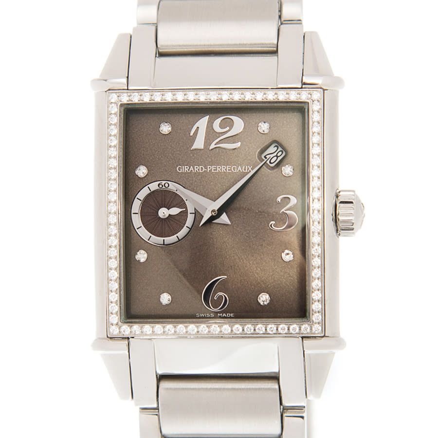 Silver-tone stainless steel case and bracelet. Fixed silver-tone bezel with diamond set stainless steel. Brown dial with silver-tone hands and diamond hour markers. Dial Type: Analog. Date display between 1 and 2 o'clock position. Automatic movement. Scratch resistant sapphire crystal. Transparent see through case back. Rectangle case shape, case size: 28 mm. Hidden clasp. Water resistant at 30 meters / 100 feet. Functions: date, hour, minute, second. Additional Info: original box, international warranty card, manual (complete accessories). Vintage 1945 Series. Luxury watch style. Watch label: Swiss Made. Girard Perregaux Vintage 1945 Automatic Diamond Brown Dial Ladies Watch 25932D11AB6111A.