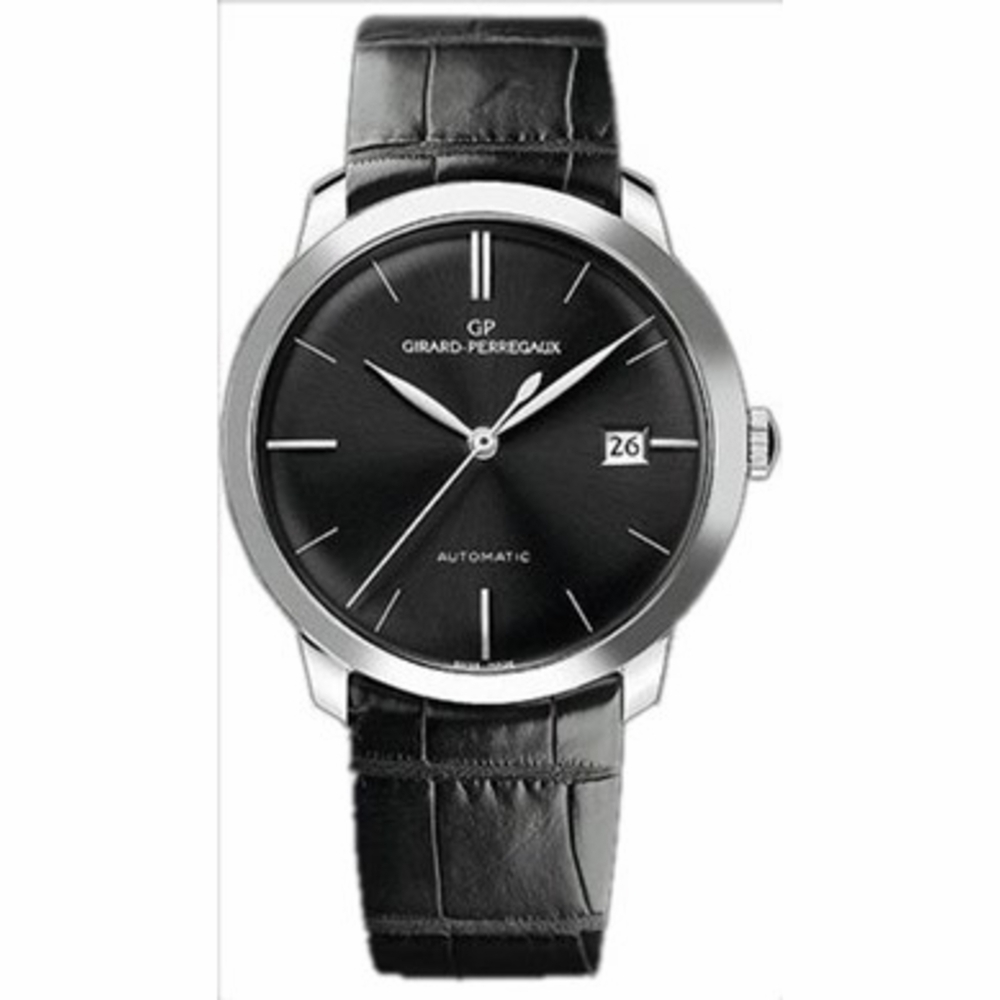 18Kt white gold case with a black leather strap. Fixed white gold bezel. Black dial with silver-tone hands and index hour markers. Dial Type: Analog. Date display at the 3 o'clock position. Automatic movement. GP03300 engine. Scratch resistant sapphire crystal. Transparent case back. Case diameter: 38 mm. Case thickness: 8.50 mm. Round case shape. Tang clasp. Water resistant at 30 meters / 100 feet. Functions: date, hour, minute, second. Luxury watch style. Watch label: Swiss Made. Girard Perregaux Classique Automatic Black Dial Mens Watch 49525-53-631-BK6A.