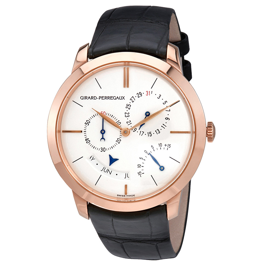 At the heart of this timepiece is Girard Perregaux Calibre GP03300-0010. The Automatic movement operates at 28800 A/h and keeps the hands revolving smoothly and accurately for precise, reliable timekeeping. It contains 32 Jewels, and picks up all the advantages of this high-performance ‘engine’, including a 46-hour power reserve.