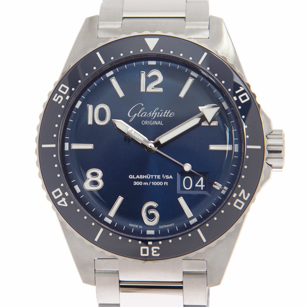 Silver-tone stainless steel case with a brushed & polished stainless steel bracelet. Uni-directional rotating blue bezel. Blue dial with silver-tone hands and Arabic numeral, index hour markers. Minute markers around the outer rim. Dial Type: Analog. Luminescent hands and markers. Date display between 4 and 5 o'clock position. Glashutte Original Calibre 36-13 Automatic movement, containing 41 Jewels, bitting at 28800 vph, and has a power reserve of approximately 100 hours. Scratch resistant sapphire crystal. Screw down crown. Transparent case back. Round case shape, case size: 43.2 mm, case thickness: 15.65 mm. Deployant buckle clasp. Water resistant at 300 meters / 1000 feet. Functions: big date, hour, minute, small second. Seaq Panorama Date Series. Dive watch style. Watch label: Made In Germany. Glashutte Original SeaQ Panorama Date Automatic Blue Dial Mens Watch 1-36-13-02-81-70.