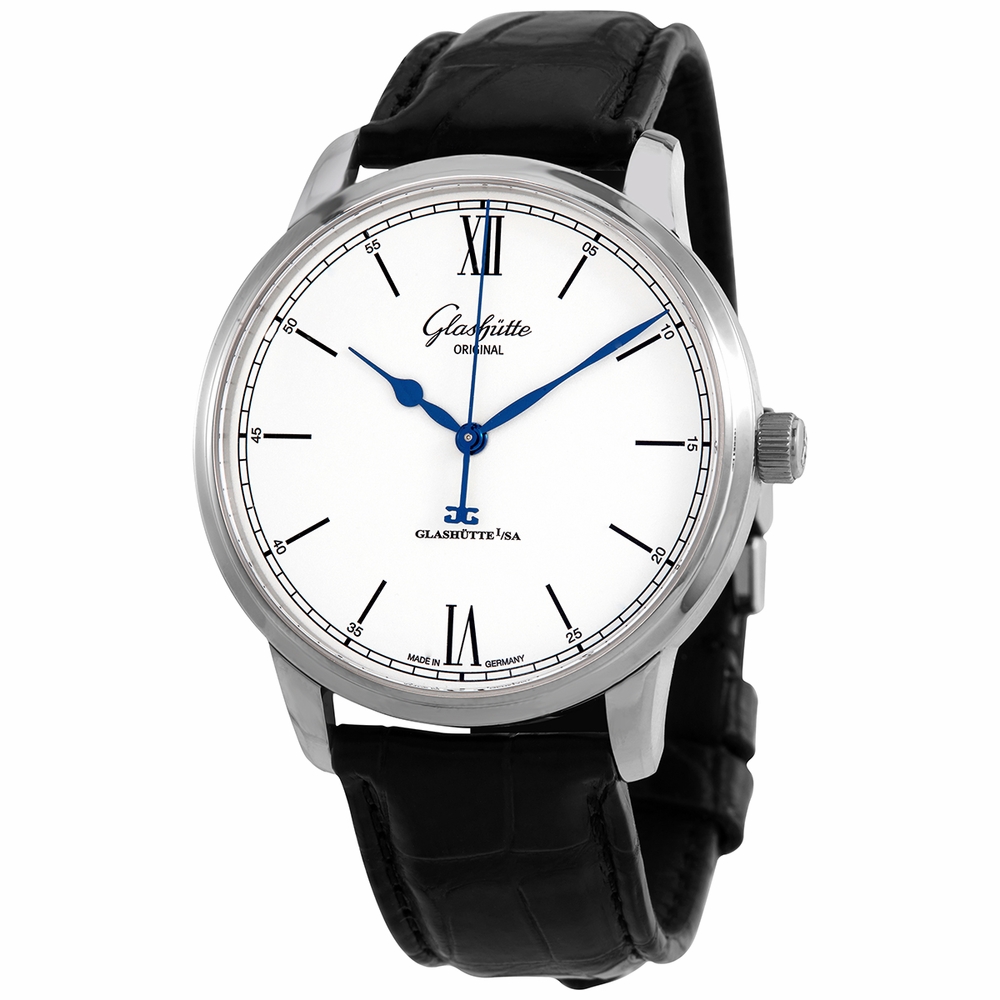 Stainless steel case with a black (alligator) leather strap. Fixed stainless steel bezel. White dial with blue hands and index hour markers. Arabic numerals mark the 6 and 12 o'clock positions. Dial Type: Analog. Glashutte calibre 36-01 automatic movement, containing 27 Jewels, bitting at 28800 vph, and has a power reserve of approximately 100 hours. Scratch resistant sapphire crystal. Screw down crown. Transparent case back. Round case shape. Case size: 40 mm. Case thickness: 10 mm. Deployment clasp. Water resistant at 50 meters / 165 feet. Functions: moon phase, hour, minute, small second. Senator Excellence Series. Luxury watch style. Watch label: Made in Germany. Glashutte Senator Excellence Automatic White Dial Mens Watch 1-36-01-01-02-30.