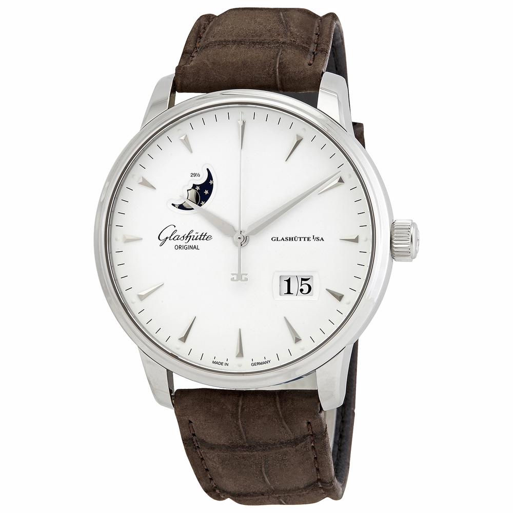 Silver-tone stainless steel case with a brown (alligator) leather strap. Fixed silver-tone stainless steel bezel. Silver dial with silver-tone alpha-style shape hands and index hour markers. Minute markers around the outer rim. Dial Type: Analog. Date display between 4 and 5 o'clock position. One subdial displaying: moonphase. Glashutte Calibre 36-01 Automatic movement, containing 27 Jewels, bitting at 28800 vph, and has a power reserve of approximately 100 hours. Scratch resistant sapphire crystal. Screw down crown. Transparent case back. Round case shape, case size: 40 mm, case thickness: 12.2 mm. Band width: 20 mm. Tang clasp. Water resistant at 50 meters / 165 feet. Functions: hour, minute, small second, moonphase. Senator Series. Luxury watch style. Watch label: Made in Germany. Glashutte Senator Excellence Panorama Date Moonphase Automatic Silver Dial Mens Watch 1-36-04-05-02-31.