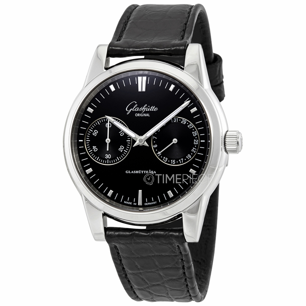Silver-tone stainless steel case with a black alligator leather strap. Fixed silver-tone stainless steel bezel. Black dial with silver-tone hands and index hour markers. Minute markers around the outer rim. Dial Type: Analog. Luminescent hands. Date display at the 3 o'clock position. Two - 60 second and date subdials. Glashutte Calibre 39-58 Automatic movement, containing 35 Jewels, bitting at 28800 vph, and has a power reserve of approximately 40 hours. Scratch resistant sapphire crystal. Skeleton transparent exhibition see through case back. Round case shape, case size: 40 mm, case thickness: 11.2 mm. Tang clasp. Water resistant at 50 meters / 165 feet. Functions: date, hour, minute, second. Senator Hand Date Series. Luxury watch style. Watch label: Made In Germany. Glashutte Senator Hand Date Automatic Mens Watch 1-39-58-01-02-04.
