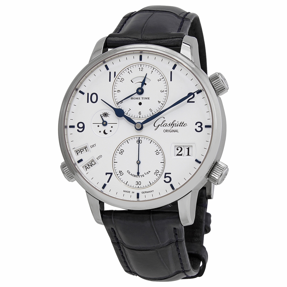Stainless steel case with a black (alligator) leather strap. Fixed stainless steel bezel. Matte white dial with blue hands and Arabic numeral hour markers. Minute markers around the outer rim. Dial Type: Analog. Date display at the 4 o'clock position. Two sub-dials displaying: seconds and12 hours (GMT and world time). Day/night indication. Power reserve indicator. Glashutte Original calibre 89-02 automatic movement with a 44-hour power reserve. Scratch resistant sapphire crystal. Pull / push crown. Transparent case back. Round case shape. Case size: 44 mm. Case thickness: 14 mm. Band width: 22 mm. Deployment clasp. Water resistant at 50 meters / 165 feet. Functions: date, hour, minute, second. Senator Cosmopolite Series. Luxury watch style. Watch label: Made in Germany. Glashutte Senator Cosmopolite Automatic Matte White Dial Mens Watch 1-89-02-03-0250.