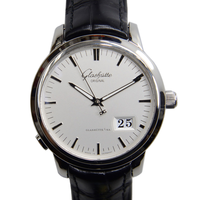 Silver-tone stainless steel case with a black alligator band. Fixed silver-tone stainless steel bezel. Silver-tone dial with silver-tone hands and index hour markers. Minute markers around the outer rim. Dial Type: Analog. Date display at the 4 o'clock position. Glashutte Calibre 100-03 automatic movement with a 55-hour power reserve. Scratch resistant sapphire crystal. Transparent case back. Round case shape. Case size: 40 mm. Buckle clasp. Water resistant at 50 meters / 165 feet. Functions: big date, hour, minute, small second. Luxury watch style. Watch label: Made In Germany. Item Variations: 1 000E+10, 1-000E+10, 1/000E+10, 1000E+10. Glashutte SeNATOr Panorama Date Automatic Mens Watch 100-03-13-02-04.