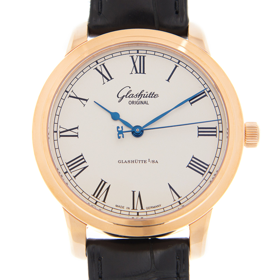 18 carat rose gold case with a black alligator leather strap. Fixed bezel. Silver dial with blue hands and Roman numeral hour markers. Dial Type: Analog. Calibre 39-59 automatic movement. Scratch resistant sapphire crystal. Pull / push crown. Case size: 40 mm. Case thickness: 9.9 mm. Round case shape. Water resistant at 50 meters / 165 feet. Functions: hour, minute, second. Luxury watch style. Watch label: Made In Germany. Glashutte Senator Silver Dial Automatic Mens Watch 39-59-01-05-04.