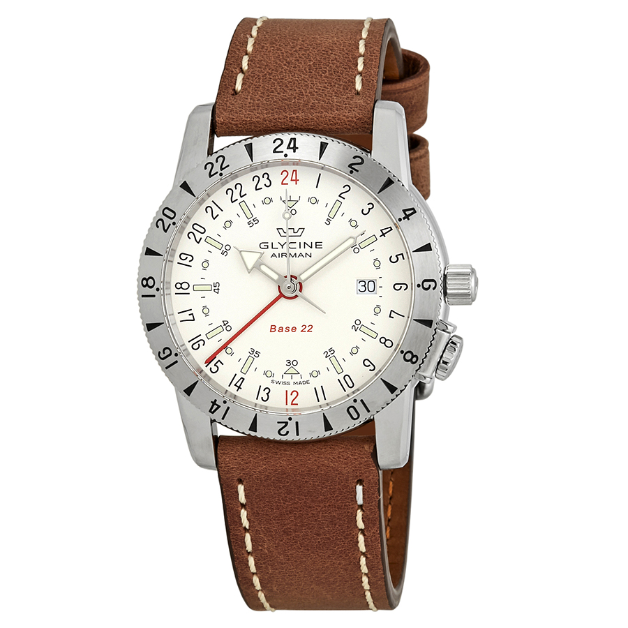 Stainless steel case with a brown (calfskin) leather strap. Bi-directional rotating stainless steel bezel showing 24 hour markers. White dial with luminous silver-tone hands and index hour markers. Minute markers. 24 hour markers around the outer rim. Dial Type: Analog. Luminescent hands and markers. Date display at the 3 o'clock position. Glycine calibre GL293 automatic movement, containing 21 Jewels, bitting at 28800 vph, and has a power reserve of approximately 42 hours. Scratch resistant sapphire crystal. Screw down crown. Transparent case back. Round case shape. Case size: 42 mm. Case thickness: 12.9 mm. Band width: 22 mm. Tang clasp. Water resistant at 200 meters / 660 feet. Functions: GMT, second time zone, hour, minute, second. Airman Base 22 Series. Casual watch style. Watch label: Swiss Made. Glycine Airman Base 22 GMT Automatic White Dial Mens Watch GL0201.