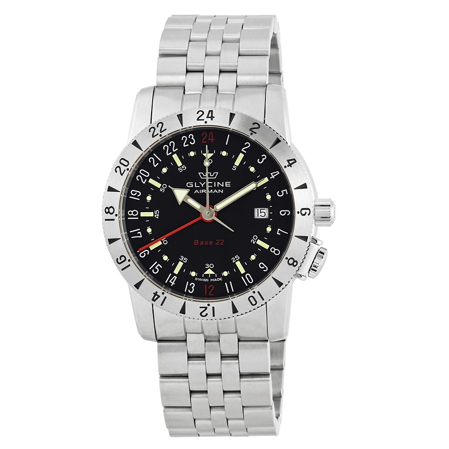 Stainless steel case with a stainless steel bracelet. Bi-directional rotating stainless steel bezel showing 24 hour markers. Black dial with luminous silver-tone hands and index hour markers. Minute markers. Arabic numeral minute markers (at 5 minute intervals). 24 hour markers around the outer rim. Dial Type: Analog. Luminescent hands and markers. Date display at the 3 o'clock position. Glycine calibre GL293 automatic movement with a 42-hour power reserve. Scratch resistant sapphire crystal. Screw down crown. Transparent case back. Round case shape. Case size: 42 mm. Case thickness: 12.2 mm. Band width: 22 mm. Fold over clasp with a push button release. Water resistant at 200 meters / 660 feet. Functions: date, hour, minute, second, 12-24 hours. Casual watch style. Watch label: Swiss Made. Glycine Airman GMT Automatic Black Dial Mens Watch GL0209.