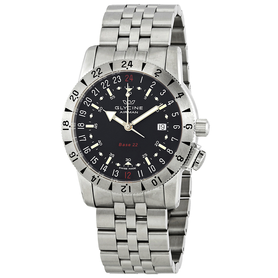 Silver-tone stainless steel case with a silver-tone stainless steel bracelet. Stainless steel bezel. Black dial with silver-tone hands and index hour markers. Dial Type: Analog. Luminescent hands and markers. Date display at the 3 o'clock position. Automatic movement. Scratch resistant sapphire crystal. Screw down crown. Transparent case back. Round case shape. Case size: 42mm. Band width: 22mm. Water resistant at 200 meters / 660 feet. Functions: date, hour, minute, second, 24-hours. Watch label: Swiss Made. Glycine Airman Automatic Black Dial Mens Watch GL0210.