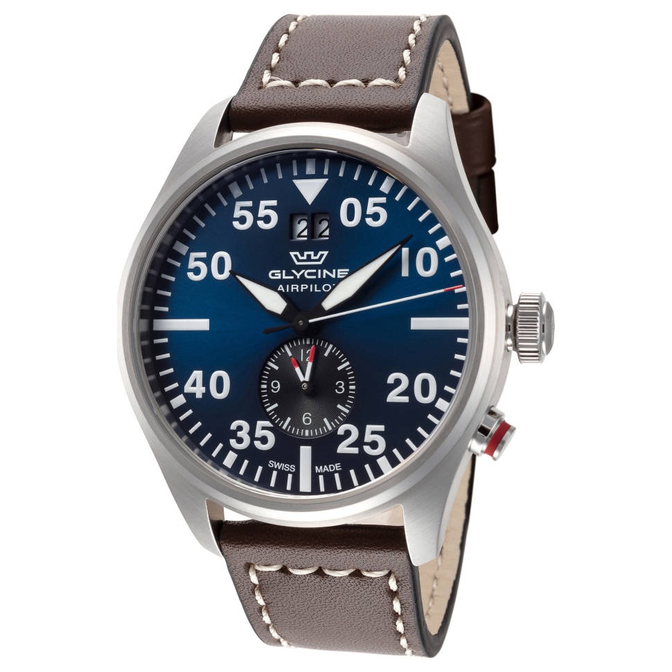 Stainless steel case with a brown leather strap. Fixed stainless steel bezel. Blue dial with luminous black hands and index hour markers. Arabic numeral minute markers (at 5 minute intervals). Minute markers around the outer rim. Dial Type: Analog. Luminescent hands and markers. Date display at the 9 o'clock position. Chronograph - two sub-dials displaying: 60 second and 30 minute. Ronda caliber 3520.D quartz movement. Scratch resistant sapphire crystal. Screw down crown. Solid case back. Round case shape. Case size: 44 mm. Case thickness: 10.75 mm. Band width: 22 mm. Tang clasp. Water resistant at 100 meters / 330 feet. Functions: chronograph, date, hour, minute, small second. Airpilot Chrono 44 Series. Casual watch style. Watch label: Swiss Movt. Glycine Airpilot Dual Time Chronograph Quartz Blue Dial Mens Watch GL0365.