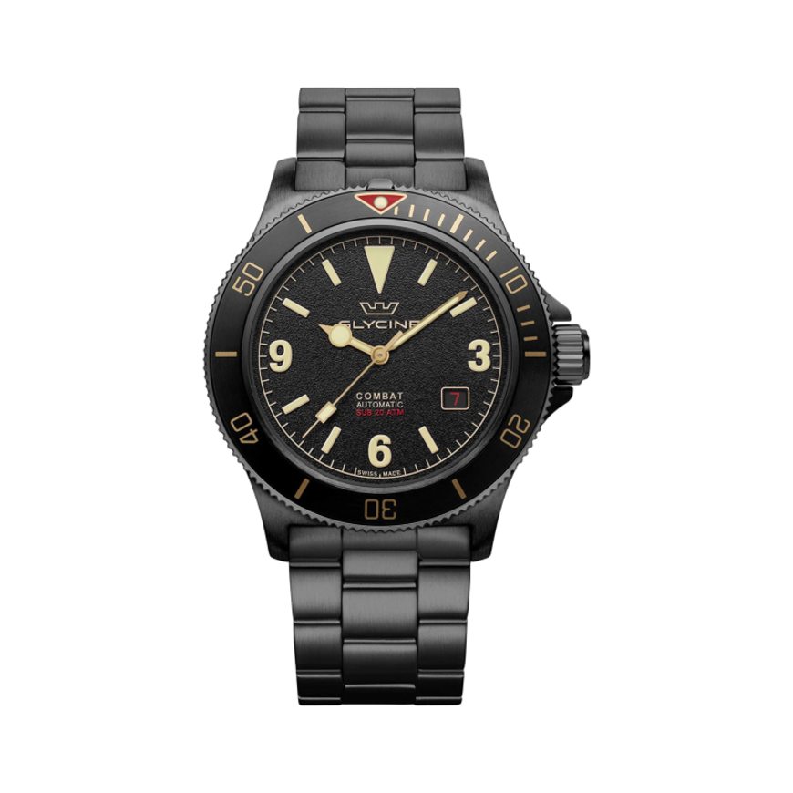 Black PVD stainless steel case with a black stainless steel bracelet. Black dial with gold-tone hands and Arabic numeral/index hour markers. Minute markers around the outer rim. Dial Type: Analog. Date display at the 4 o'clock position. Glycine Calibre GL224 Automatic movement, containing 25 Jewels, bitting at 28800 vph, and has a power reserve of approximately 38 hours. Scratch resistant sapphire crystal. Round case shape, case size: 42 mm. Water resistant at 200 meters / 660 feet. Functions: date, hour, minute, second. Combat Series. Watch label: Swiss Made. Glycine Combat Automatic Black Dial Mens Watch GL0290.