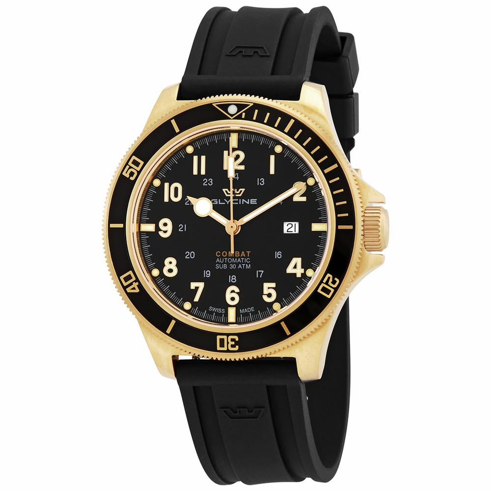 Rose gold PVD stainless steel case with a black silicone strap. Uni-directional rotating black PVD bezel with a black ring. Black dial with luminous rose gold-tone hands and Arabic numeral hour markers. 24 hour markers. Minute markers around the outer rim. Dial Type: Analog. Luminescent hands and markers. Date display at the 3 o'clock position. Sellita caliber SW200 automatic movement, containing 26 Jewels, bitting at 28800 vph, and has a power reserve of approximately 38 hours. Scratch resistant sapphire crystal. Screw down crown. Solid case back. Round case shape. Case size: 46 mm. Case thickness: 10.15 mm. Band width: 22 mm. Band length: 8 inches. Tang clasp. Water resistant at 300 meters / 1000 feet. Functions: date, hour, minute, second. Combat Sub 46 Series. Casual watch style. Watch label: Swiss Made. Glycine Combat Sub 46 Automatic Black Dial Mens Watch GL0292.