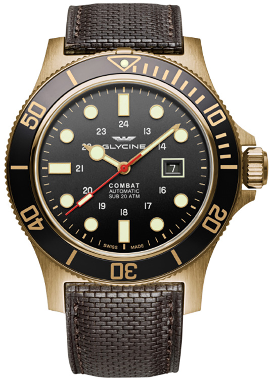Bronze case with a brown leather strap. Uni-directional rotating bronze bezel with a black ring. Black dial with luminous rose gold-tone hands and dot hour markers. 24 hour markers. Minute markers around the outer rim. Dial Type: Analog. Luminescent hands and markers. Date display at the 2 o'clock position. Caliber GL224 automatic movement with a 38-hour power reserve. Sapphire crystal scratch resistant crystal. Screw down crown. Solid case back. Round case shape. Case size: 48 mm. Case thickness: 11 mm. Band width: 24 mm. Band length: 8 inches. Tang clasp. Water resistant at 200 meters / 660 feet. Functions: date, hour, minute, second. Combat Sub Series. Casual watch style. Watch label: Swiss Made. Glycine Combat Sub Automatic Black Dial Mens Watch GL0243.