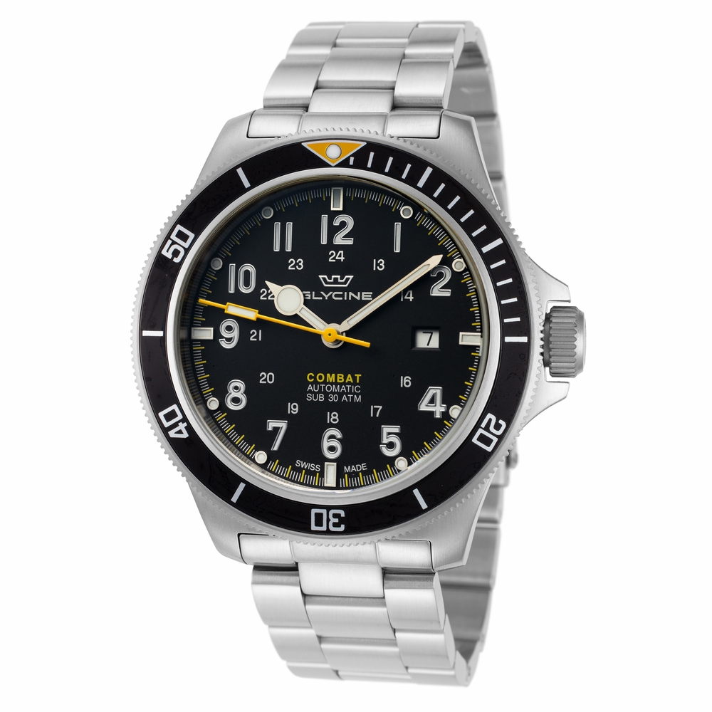 Stainless steel case with a stainless steel bracelet. Uni-directional rotating stainless steel bezel with a black ring. Black dial with luminous silver-tone hands and Arabic numeral hour markers. 24 hour markers. Minute markers around the outer rim. Dial Type: Analog. Luminescent hands and markers. Date display at the 3 o'clock position. Caliber GL224 automatic movement with a 38-hour power reserve. Scratch resistant sapphire crystal. Screw down crown. Solid case back. Round case shape. Case size: 46 mm. Case thickness: 10.15 mm. Band width: 22 mm. Band length: 7 inches. Fold over clasp. Water resistant at 300 meters / 1000 feet. Functions: date, hour, minute, second. Combat Sub Series. Casual watch style. Watch label: Swiss Made. Glycine Combat Sub Automatic Black Dial Mens Watch GL0255.