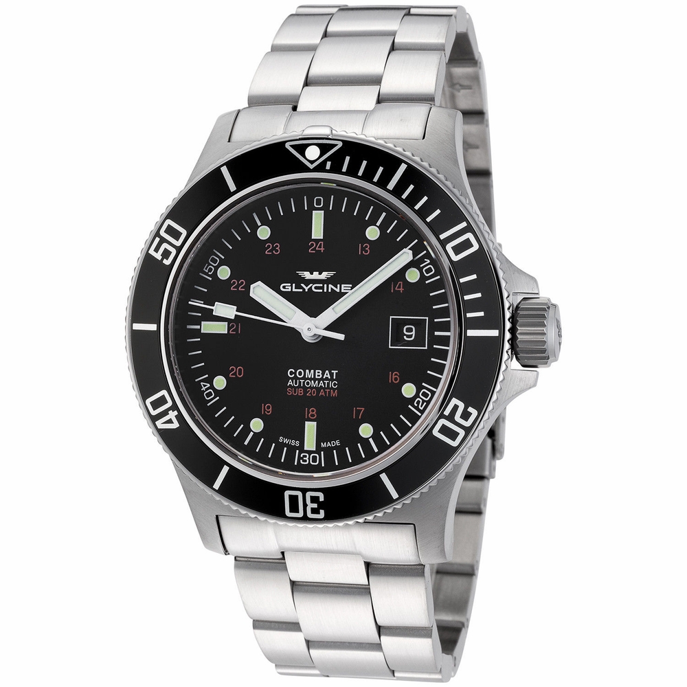 Stainless steel case with a stainless steel bracelet. Uni-directional rotating (60 clicks) stainless steel bezel with an inlaid black PVD ring. Black dial with luminous silver-tone hands and dot hour markers. 24 hour markers. Minute markers around the outer rim. Dial Type: Analog. Luminescent hands and markers. Date display at the 3 o'clock position. Caliber GL224 automatic movement with a 38-hour power reserve. Scratch resistant sapphire crystal. Screw down crown. Solid case back. Round case shape. Case size: 42 mm. Case thickness: 11 mm. Band width: 22 mm. Deployment clasp. Water resistant at 200 meters / 660 feet. Functions: date, hour, minute, second. Combat Sub Series. Casual watch style. Watch label: Swiss Made. Glycine Combat Sub Automatic Black Dial Mens Watch GL0185.