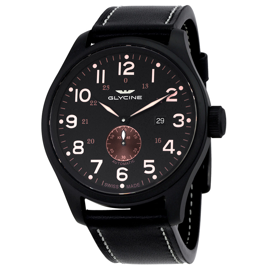 Black PVD stainless steel case with a black leather strap. Fixed black PVD bezel. Black dial with luminous black hands and Arabic numeral hour markers. 24 hour markers. Minute markers around the outer rim. Dial Type: Analog. Luminescent hands and markers. Date display at the 3 o'clock position. Glycine Calibre GL260 automatic movement with a 38-hour power reserve. Scratch resistant sapphire crystal. Screw down crown. Transparent case back. Case size: 48 mm. Case thickness: 11.20 mm. Round case shape. Band width: 24 mm. Tang clasp. Water resistant at 100 meters / 330 feet. Functions: date, hour, minute, second, 24 hour. Casual watch style. Watch label: Swiss Made. Glycine KMU Black Dial Automatic Mens Leather Watch GL0133.