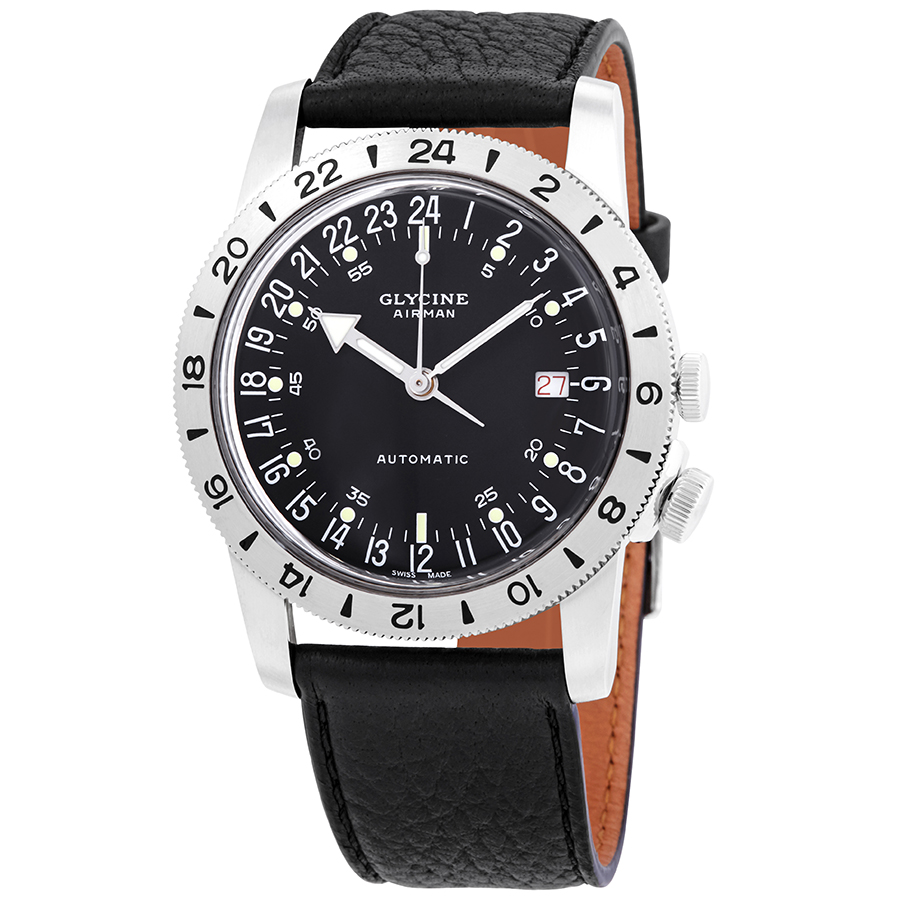 Silver-tone stainless steel case with a black genuine leather strap. Bi-directional rotating silver-tone stainless steel bezel. Black dial with silver-tone hands and index hour markers. Dial Type: Analog. Luminescent hands and markers. Date display at the 3 o'clock position. Third time zone displayed on a bidirectional bezel subdials. Glycine Calibre GL293 automatic movement with a 42-hour power reserve. Scratch resistant acrylic crystal. Solid case back. Round case shape, case size: 40 mm, case thickness: 12.5 mm. Band width: 22 mm. Buckle clasp. Functions: date, GMT, second time zone, hour, minute, second. Additional Info: limited to 1000 worldwide. Military watch style. Watch label: Swiss Made. Glycine Airman No. 1 Limited Edition Automatic Black Dial Mens Watch GL0163.