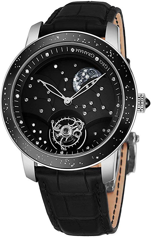 18kt white gold case with a black hand-sewn alligator leather strap. Fixed black domed and metal coated milky way sapphire bezel. Black with constellation of 48 diamonds dial with 18kt white gold hands. Minute markers around the outer rim. Dial Type: Analog. Luminescent hands and markers. Graham Calibre G1769 hand wind movement with a 96-hour power reserve. Scratch resistant sapphire crystal. Transparent case back. Round case shape, case size: 46 mm, case thickness: 17.5 mm. Band width: 21.5 mm, band length: 8 inches. Folding clasp. Water resistant at 30 meters / 100 feet. Functions: hour, minute, second, manual flying tourbillon, moon retrograde with precision of 122 years. Additional Info: limited edition of 8 pieces. hand-painted moon. Luxury watch style. Watch label: Swiss Made. Graham Geo The Moon Tourbillon Black Dial Mens Limited Edition Watch 2GGAW.B01A.