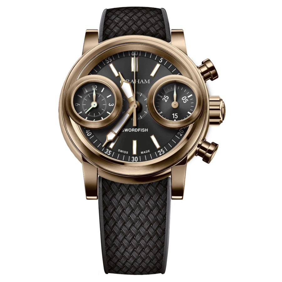 Gold-tone bronze case with a black rubber strap. Fixed gold-tone bronze bezel. Black dial with Arabic & index hour markers. Minute scale around the inner rim. Dial Type: Analog. Luminescent hands and markers. One subdial displaying: 30 minute. G1710, automatic chronograph with co-axial counters 28'800 A/h (4Hz) automatic movement. Scratch resistant sapphire crystal. Pull / push crown. Transparent case back. Round case shape, case size: 46 mm. Tang clasp. Water resistant at 100 meters / 330 feet. Functions: chronograph, second, minute, hour. Swordfish Series. Sport watch style. Watch label: Swiss Made. Graham Swordfish Chronograph Black Dial Unisex Watch 2SXAK.B02A.