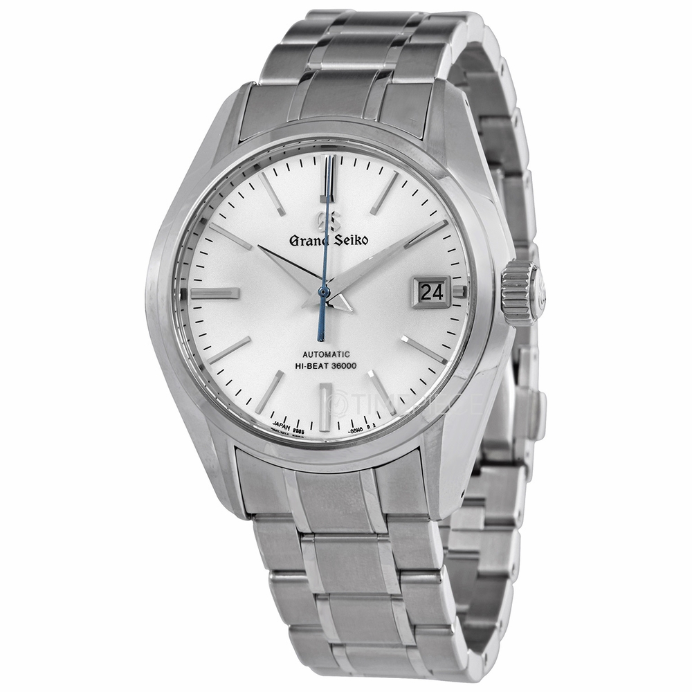 Stainless steel case with a stainless steel bracelet. Fixed stainless steel bezel. Silver dial with silver-tone hands and index hour markers. Minute markers around the outer rim. Dial Type: Analog. Date display at the 3 o'clock position. Grand Seiko caliber 9S85 Automatic movement, containing 37 Jewels, bitting at 36000 vph, and has a power reserve of approximately 55 hours. Scratch resistant sapphire crystal. Screw down crown. Transparent case back. Round case shape. Case size: 40 mm. Case thickness: 13.3 mm. Fold over clasp with a safety release. Water resistant at 100 meters / 330 feet. Functions: date, hour, minute, second. Heritage Series. Casual watch style. Watch label: Japan Movt. Grand Seiko Heritage Automatic Silver Dial Mens Watch SBGH201g.