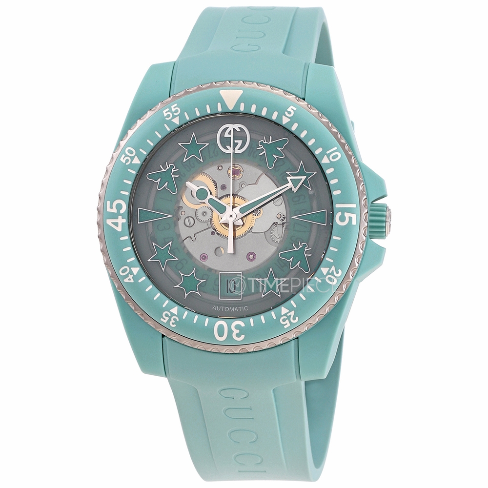 Blue rubber case and strap. Blue ceramic bezel. Transparent dial with silver-tone hands and index hour markers. Minute markers around the outer rim. Dial Type: Analog. Luminescent hands and markers. Date display at the 6 o'clock position. Automatic movement. Round case shape, case size: 40 mm. Functions: date, hour, minute, second. Dive Series. Casual watch style. Watch label: Swiss Made. Gucci Dive Automatic Unisex Watch YA136344.