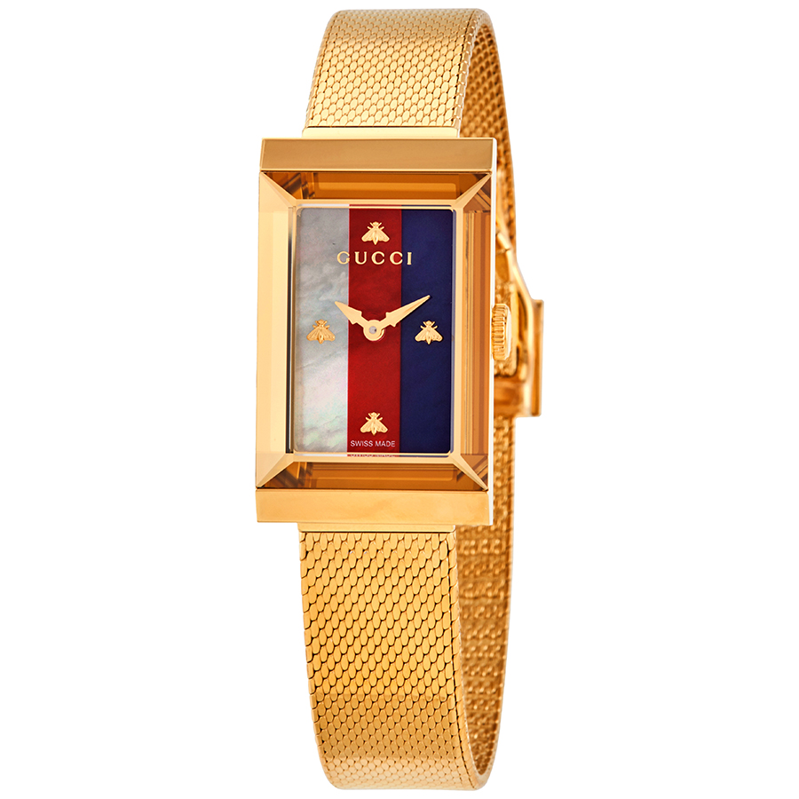 Yellow gold PVD stainless steel case with a yellow gold PVD stainless steel mesh bracelet. Fixed yellow gold PVD bezel. White, red, blue web mother of pearl dial with yellow gold-tone hands. Bee motifs set at the 3, 6, 9 and 12 o'clock positions. Dial Type: Analog. Quartz movement. Scratch resistant sapphire crystal. Pull / push crown. Solid case back. Rectangle case shape. Case dimensions: 21 mm x 34 mm. Case thickness: 7.7 mm. Band width: 14 mm. Band length: 7.75 inches. Fold over slip throgh clasp. Water resistant at 30 meters / 100 feet. Functions: hour, minute. Dress watch style. Watch label: Swiss Made. Gucci G-Frame Quartz White, Red, Blue Web Mother of Pearl Dial Ladies Watch YA147410.