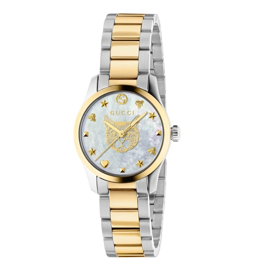 Silver-tone stainless steel case with a two-tone (silver-tone and yellow gold-tone) stainless steel bracelet. Fixed yellow gold-tone stainless steel bezel. Mother of pearl dial with yellow gold-tone hands and index hour markers. Dial Type: Analog. Quartz movement. Round case shape, case size: 27 mm. Fold over clasp. Functions: hour, minute, second. G-timeless Series. Casual watch style. Gucci G-Timeless Quartz Ladies Watch YA1265012.