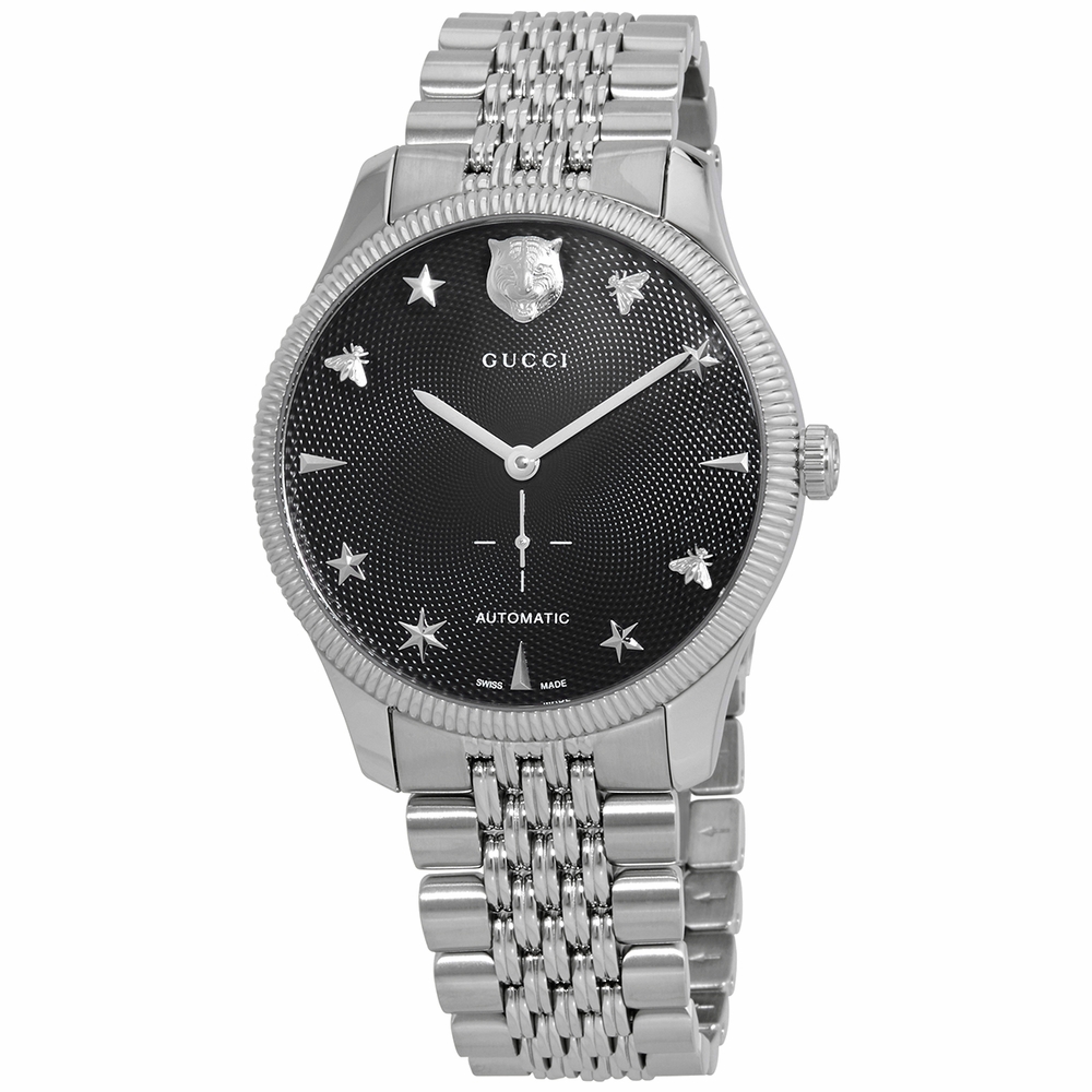 Stainless steel case with a stainless steel bracelet. Fixed stainless steel bezel. Black dial with silver-tone hands and bee and star index hour markers. The tiger head logo appears at the 12 o'clock position. Dial Type: Analog. Small seconds sub-dial. ETA caliber 2895-2 automatic movement, based upon ETA 2892-A2, containing 27 Jewels, bitting at 28800 vph, and has a power reserve of approximately 42 hours. Scratch resistant sapphire crystal. Pull / push crown. Transparent case back. Round case shape. Case size: 40 mm. Fold over clasp with a push button release. Water resistant at 50 meters / 165 feet. Functions: hour, minute, small second. G-timeless Series. Luxury watch style. Watch label: Swiss Made. Gucci G-Timeless Automatic Black Dial Mens Watch YA126353.