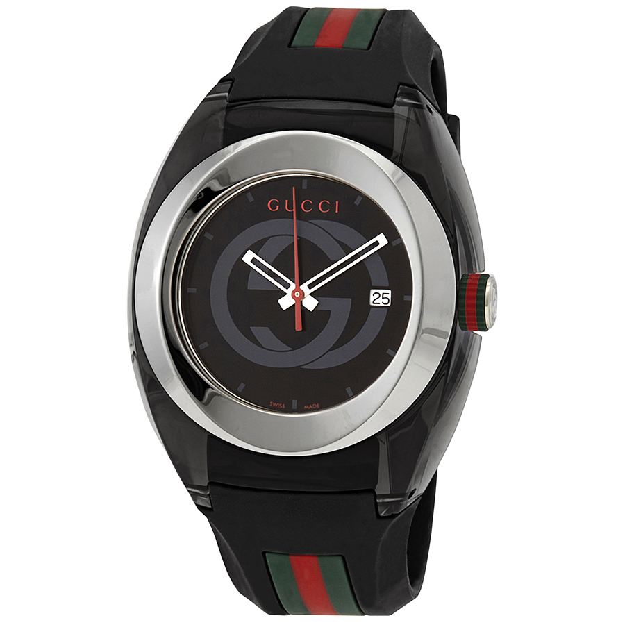 Transparent black stainless steel and nylon case with a black stainless steel bracelet. Fixed stainless steel bezel. Sun-brushed black dial with silver-tone hands and index hour markers. Dial Type: Analog. Date display at the 3 o'clock position. Quartz movement. Scratch resistant mineral crystal. Pull / push crown. Solid case back. Round case shape. Case size: 46 mm. Buckle clasp. Water resistant at 50 meters / 165 feet. Functions: date, hour, minute, second. Watch label: Swiss Made. Gucci Sync XXL Sun-Brushed Black Dial Mens Watch YA137101.