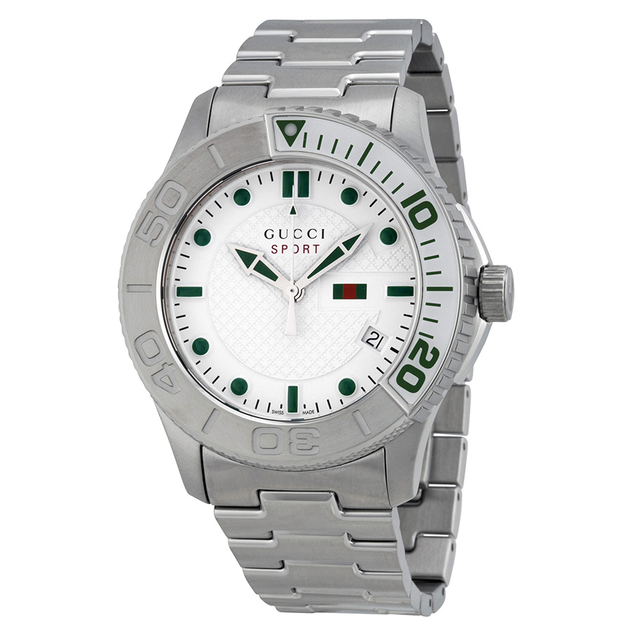 Stainless steel case with a stainless steel link bracelet. Unidirectional stainless steel bezel. Silver dial with luminous hands and dot hour markers. Minute markers around the outer rim. Dial Type: analog. Date display appears at the 4 o'clock position. Quartz movement. Scratch resistant sapphire crystal. Push / pull crown. Solid case back. Case diameter: 44 mm. Case thickness: 10 mm. Bracelet width: 23 mm. Hidden deployment clasp. Water resistant at 100 meters/ 330 feet. Functions: hours, minutes, seconds, calendar. Dress watch style. Gucci G Timeless Silver Dial Stainless Steel Mens Watch YA126232.