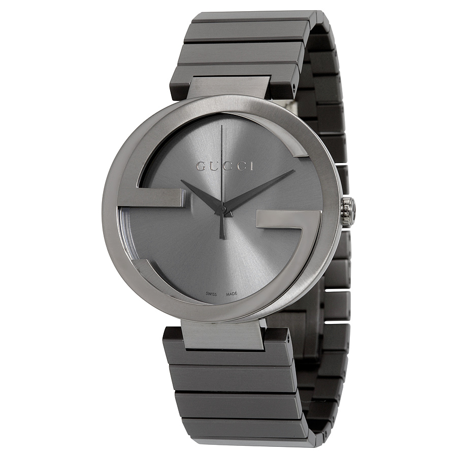 Grey PVD stainless steel case with a grey PVD stainless steel bracelet. Fixed grey PVD Interlocking-G bezel. Anthracite dial with black hands. No markers. Dial Type: Analog. Quartz movement. Scratch resistant mineral crystal. Pull / push crown. Solid case back. Case size: 42 mm. Case thickness: 8 mm. Round case shape. Band width: 20.3 mm. Band length: 8 inches. Deployment clasp. Water resistant at 50 meters / 165 feet. Functions: hour, minute, second. Dress watch style. Watch label: Swiss Made. Gucci Interlocking G Anthracite Dial Grey PVD Mens Watch YA133210.