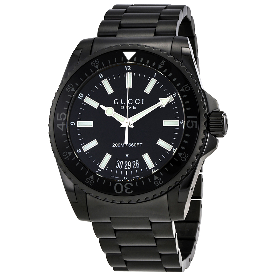 Black PVD stainless steel stainless steel case and bracelet. Fixed black PVD bezel. Black dial with luminous silver-tone hands and index hour markers. Minute markers around the outer rim. Dial Type: Analog. Date display at the 6 o'clock position. Quartz movement. Scratch resistant sapphire crystal. Case size: 45 mm. Case thickness: 12 mm. Round case shape. Bracelet width: 22 mm. Deployment clasp. Water resistant at 200 meters / 660 feet. Functions: date, hour, minute, second. Luxury watch style. Gucci Dive Black Dial Stainless Steel Mens Watch YA136205.